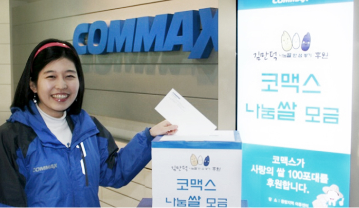 COMMAX puts social service, of which our employees can participate and share heart by themselves, in practice. We’re sponsoring 6 local social welfare organizations consistently at Seongnam area since 2006, while creating various social contribution activities, such as ‘staking ten thousand of rice pack commemorating Kim Man Deok’ campaign for giving aid to unfortunate neighbors and ‘Beautiful Walking Contest’ for promoting culture of donor, based on voluntary participation of our employees.
